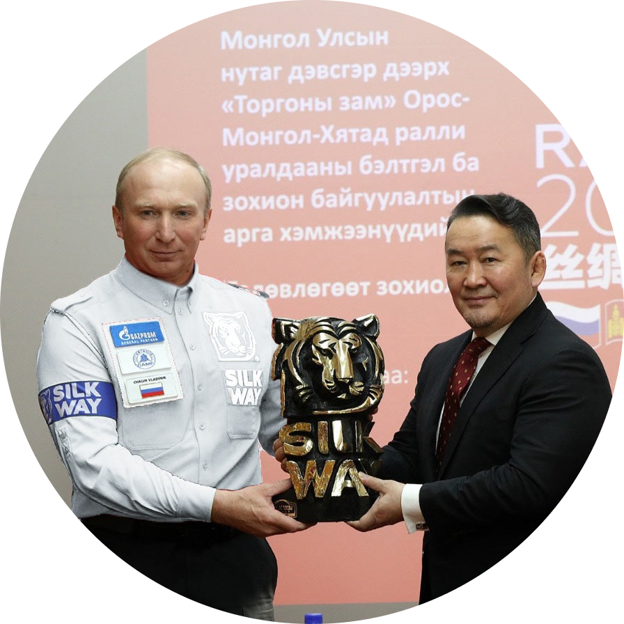 V. Chagin, Head of the International Silk Way Rally Project, and President of Mongolia Kh.Battulga, 2018